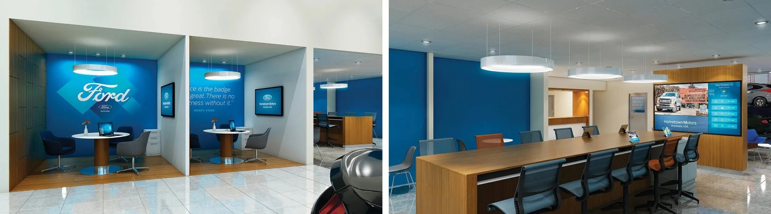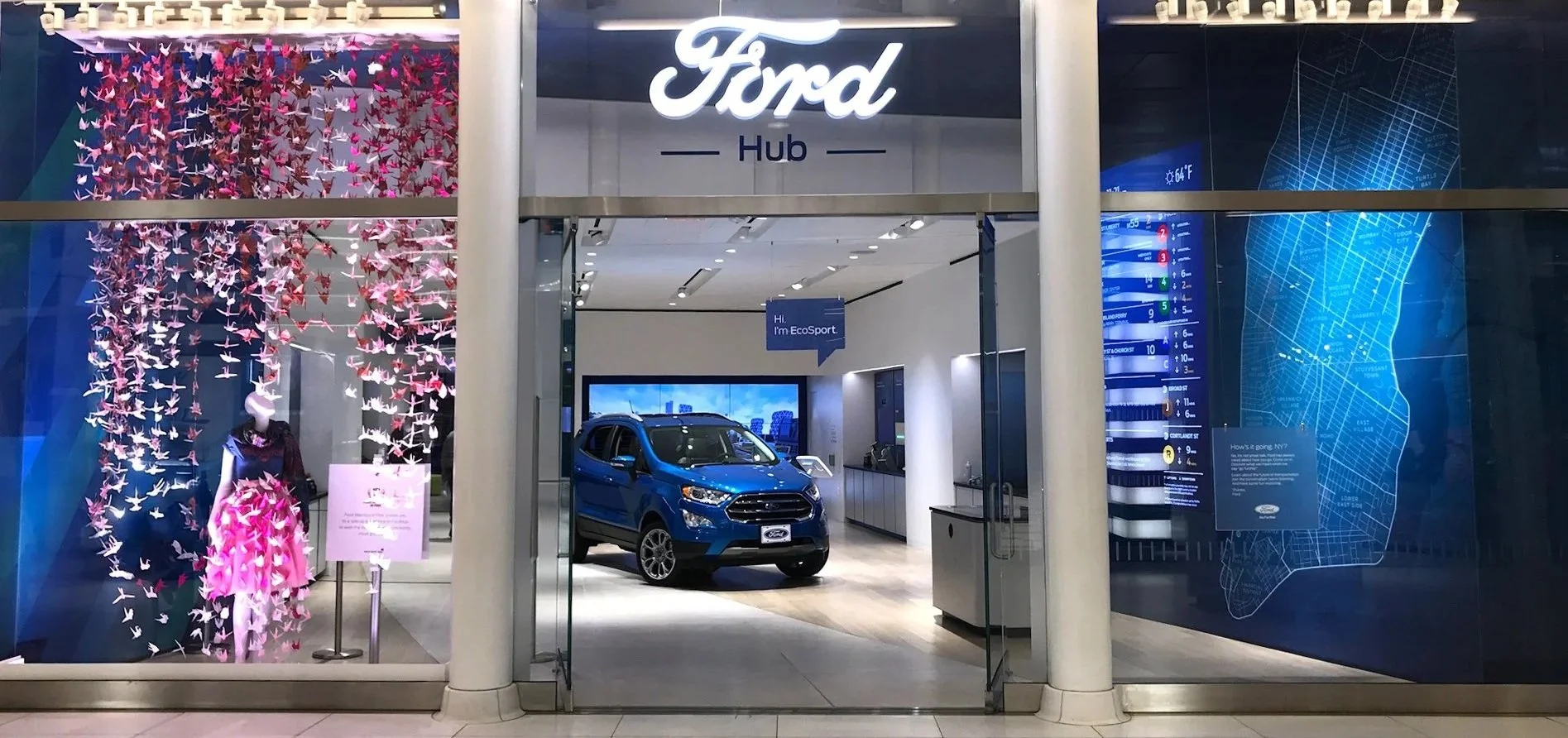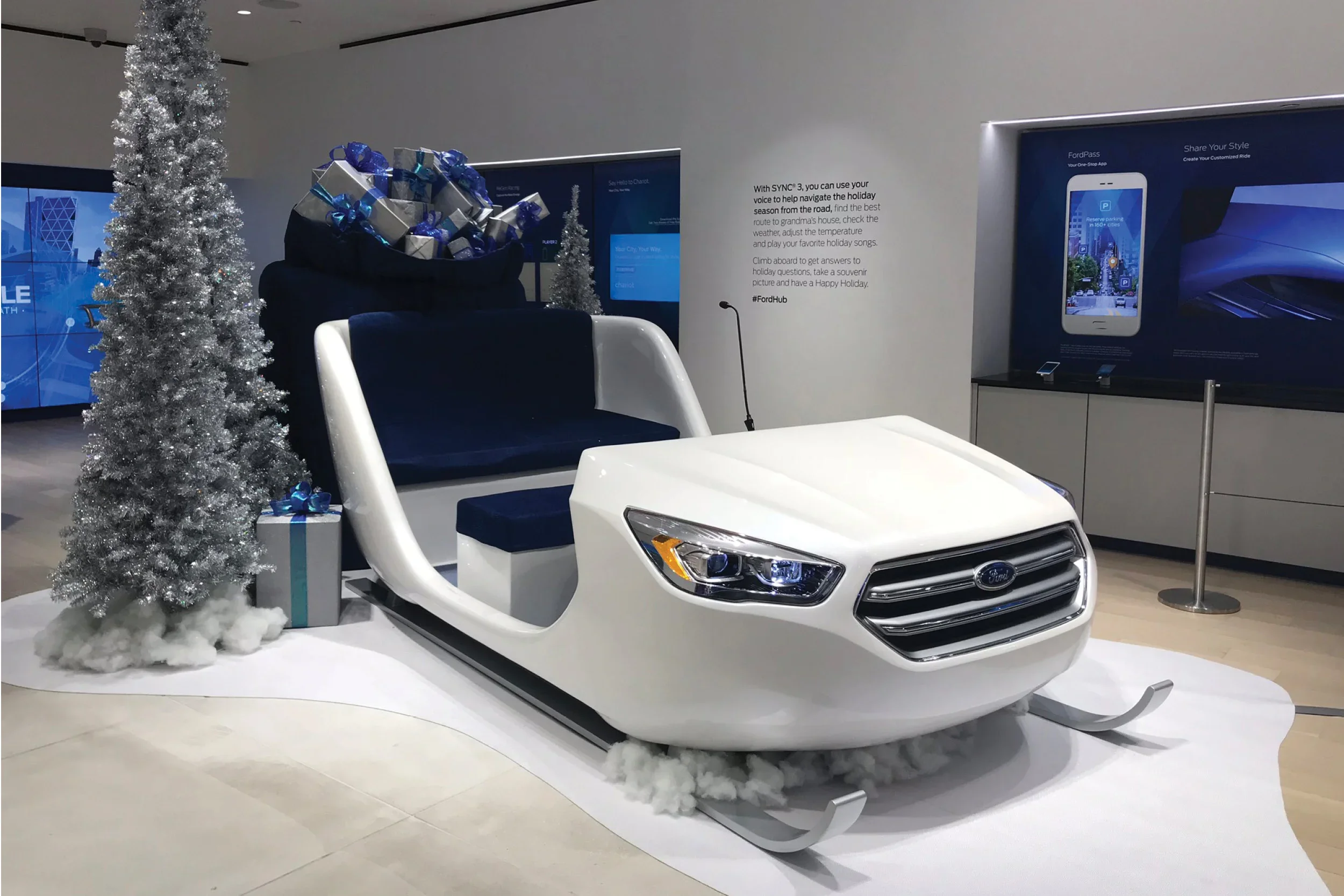 Collaborated with agency and activation partners to translate the Ford brand into physical environments and experiences. Contributed to the overall aesthetic and experiential design of FordHub at Westfield World Trade Center, an experimental space connecting customers to the future of mobility. Projects ranged from retail environments to employee uniforms to special activations — including window displays and activations for Warriors In Pink, Ford’s Breast Cancer Awareness Initiative, and even a “talking sleigh” to announce Ford’s voice-activated features. Also supported dealership design through furniture selection, materiality decisions, and environmental graphics.