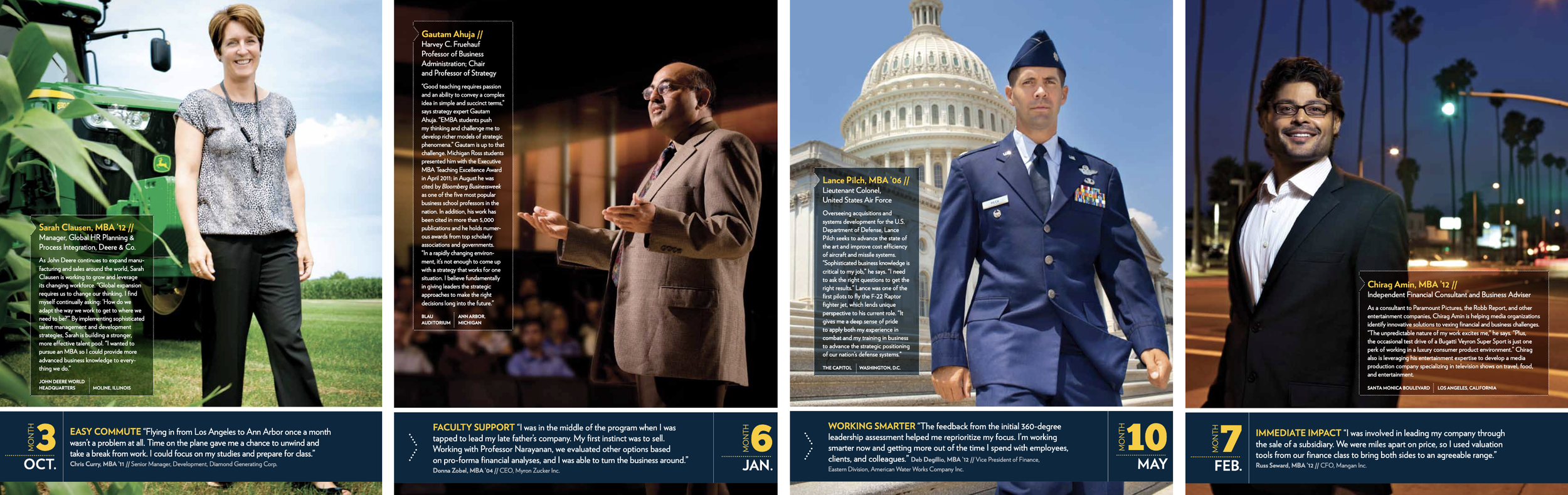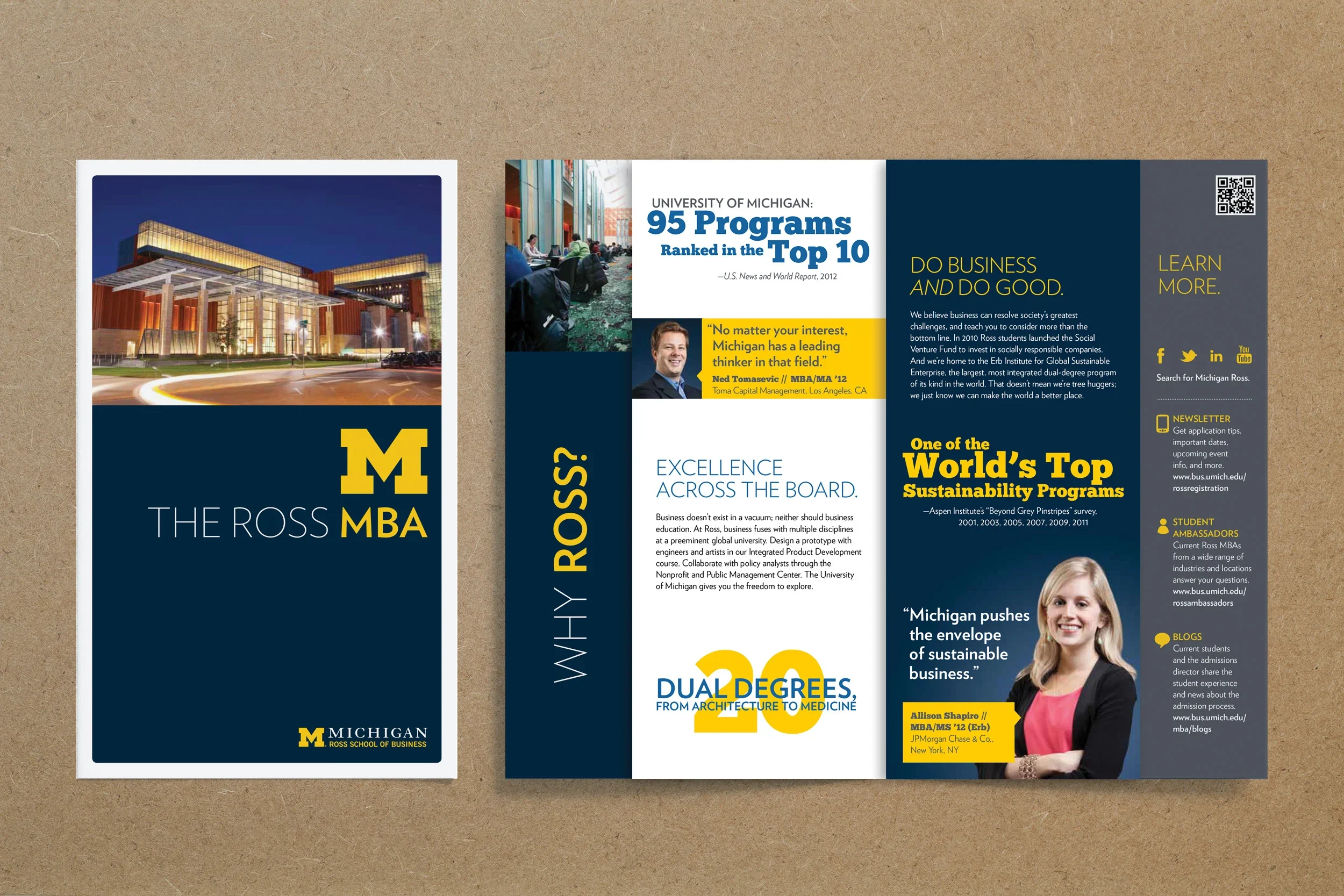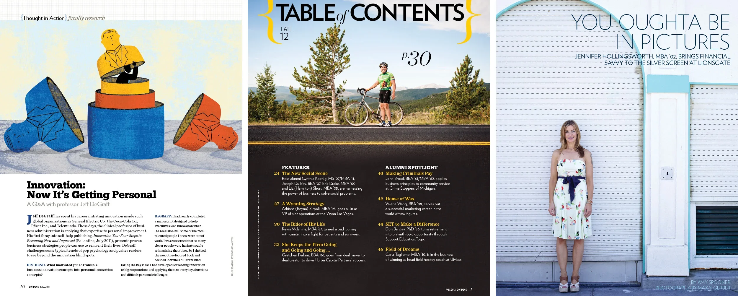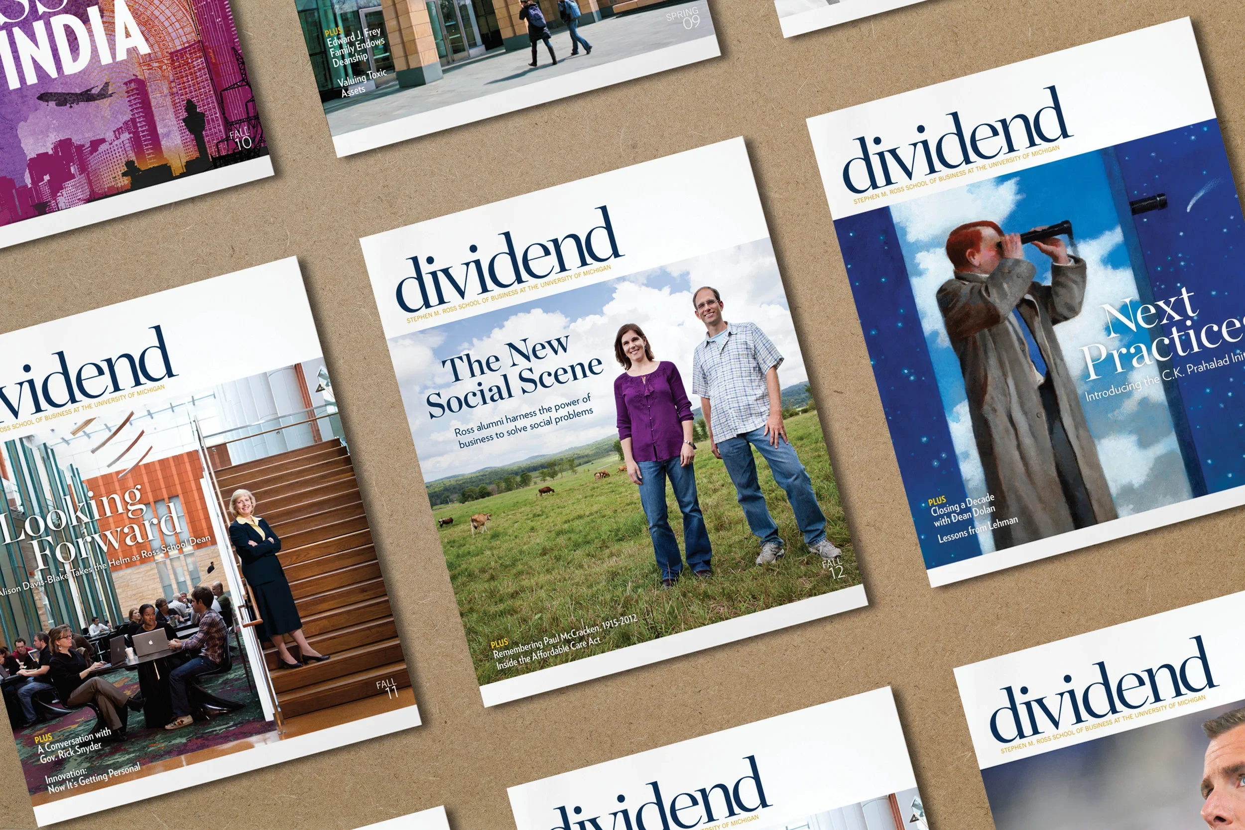 As in-house designer, led a comprehensive rebrand of the Ross School of Business communications, inspired by the idea that “it’s the people who make the school.” Executed the identity across marketing materials, events, acceptance packages, and more for the entire suite of academic offerings from the business school through design and art direction of photography and illustration. Redesigned and art directed the quarterly Dividend Magazine and managed a global network of freelance designers, illustrators, and photographers.